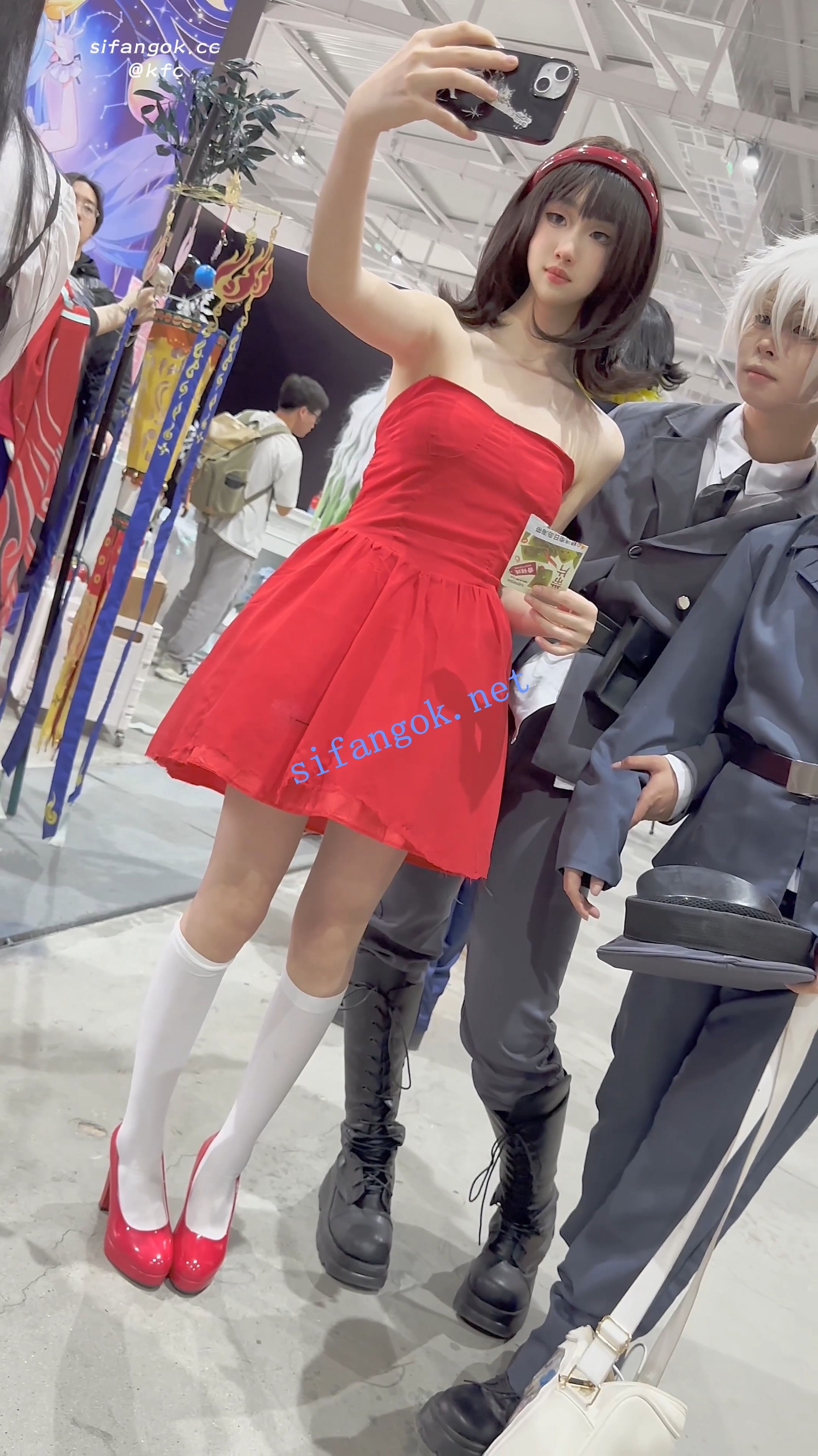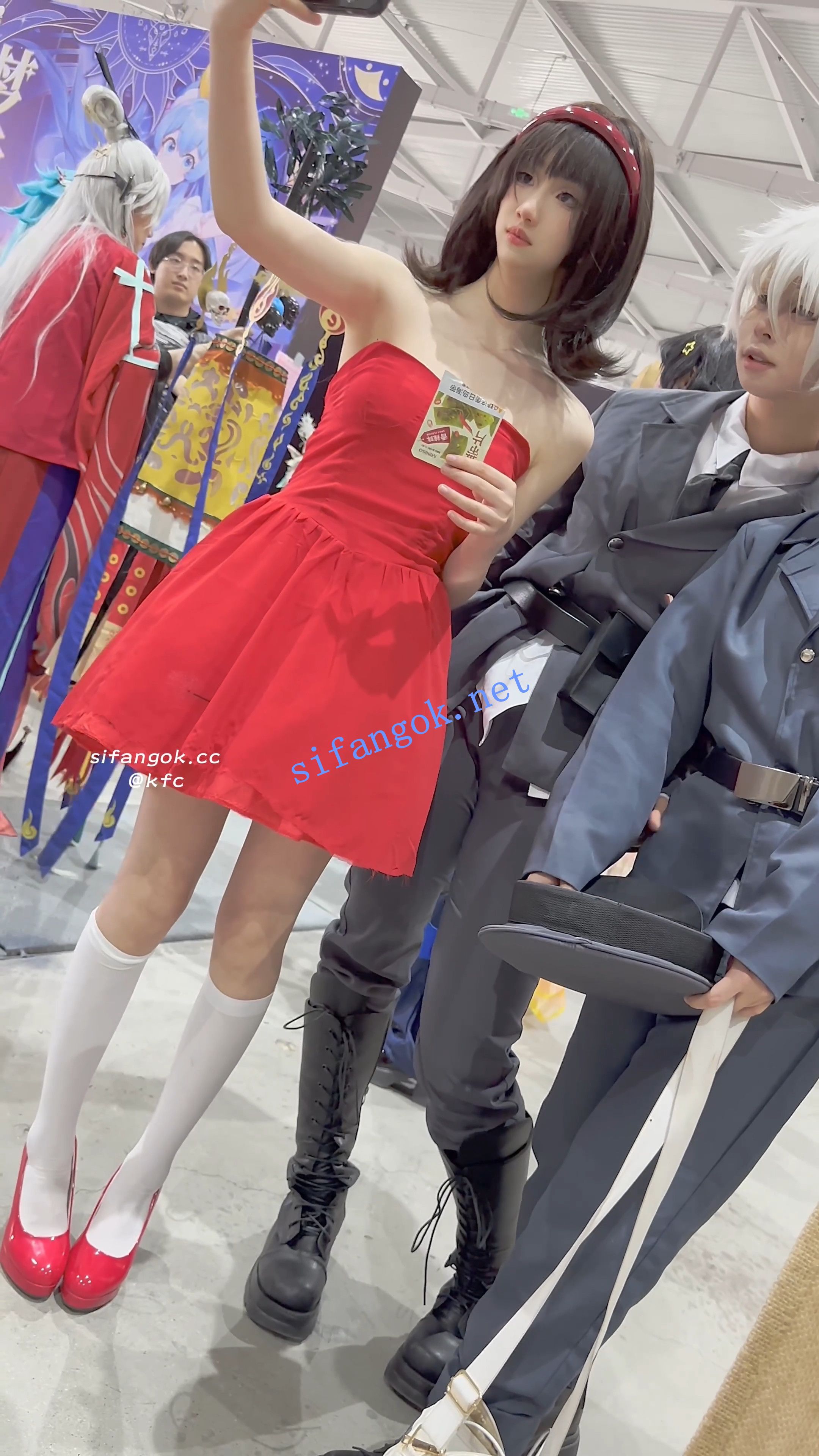 【KFC】学生妹打扮精致逛展·红色抹胸长裙·一次性内内贴着CD